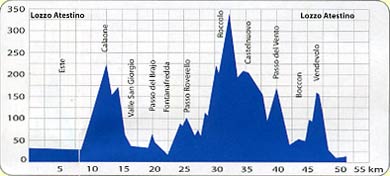 | Lunghezza complessiva di quasi 52 km con un dislivello di oltre 1000 metri. Molto impegnative le salite al Vendevolo, Roccolo e Calaone con pendenze talvolta del 15%. Risulterebbero quasi proibitive se percorse nel senso contrario, si raggiungono infatti i 20% di pendenza. Vale certo la pena comunque scoprire questi piccoli angoli di colle ancora poco attraversati da auto. |